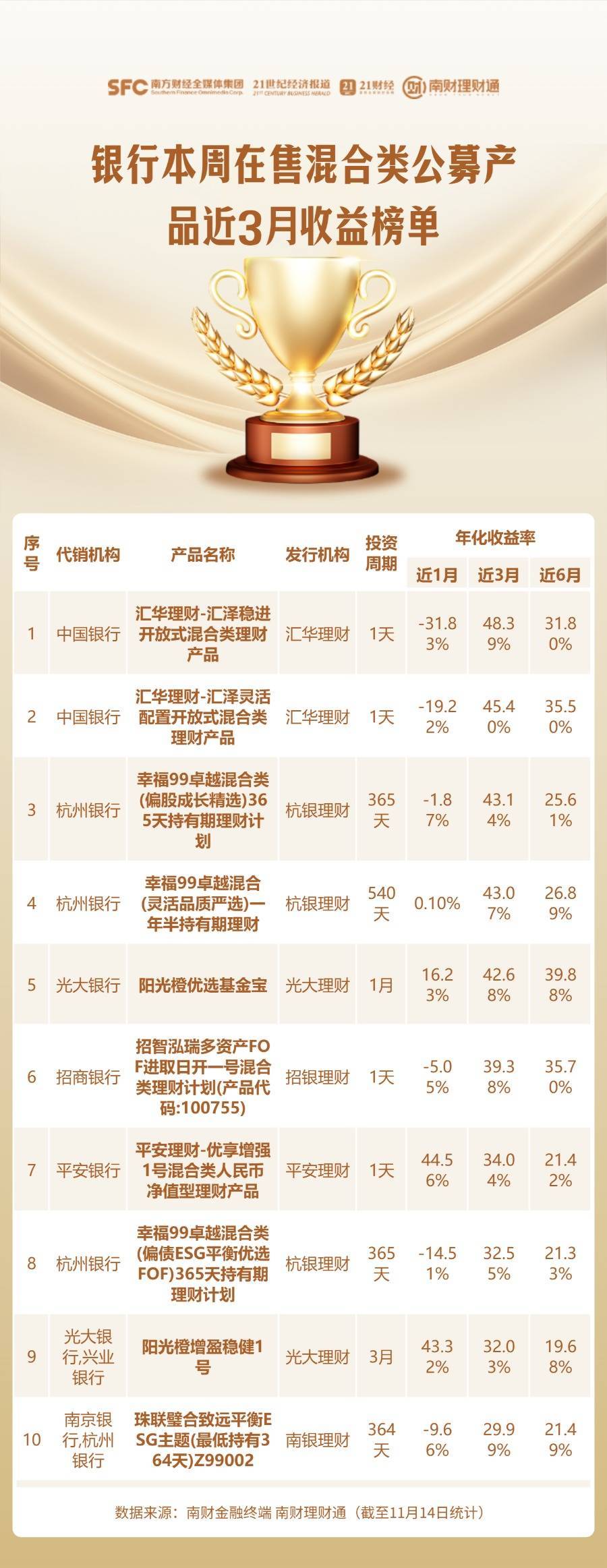 编者按:当前银行理财货架产品琳琅满目,诸如“增强”“稳健”“均衡”等名称相近、特征模糊的产品层出不穷,投资者应如何甄别与选择?为降低投资者的选择成本,南财理财通课题组从代销机构角度入手,聚焦各渠道当周在售的理财产品,搜罗其中业绩表现优异者,并发布代销产品业绩榜单。
